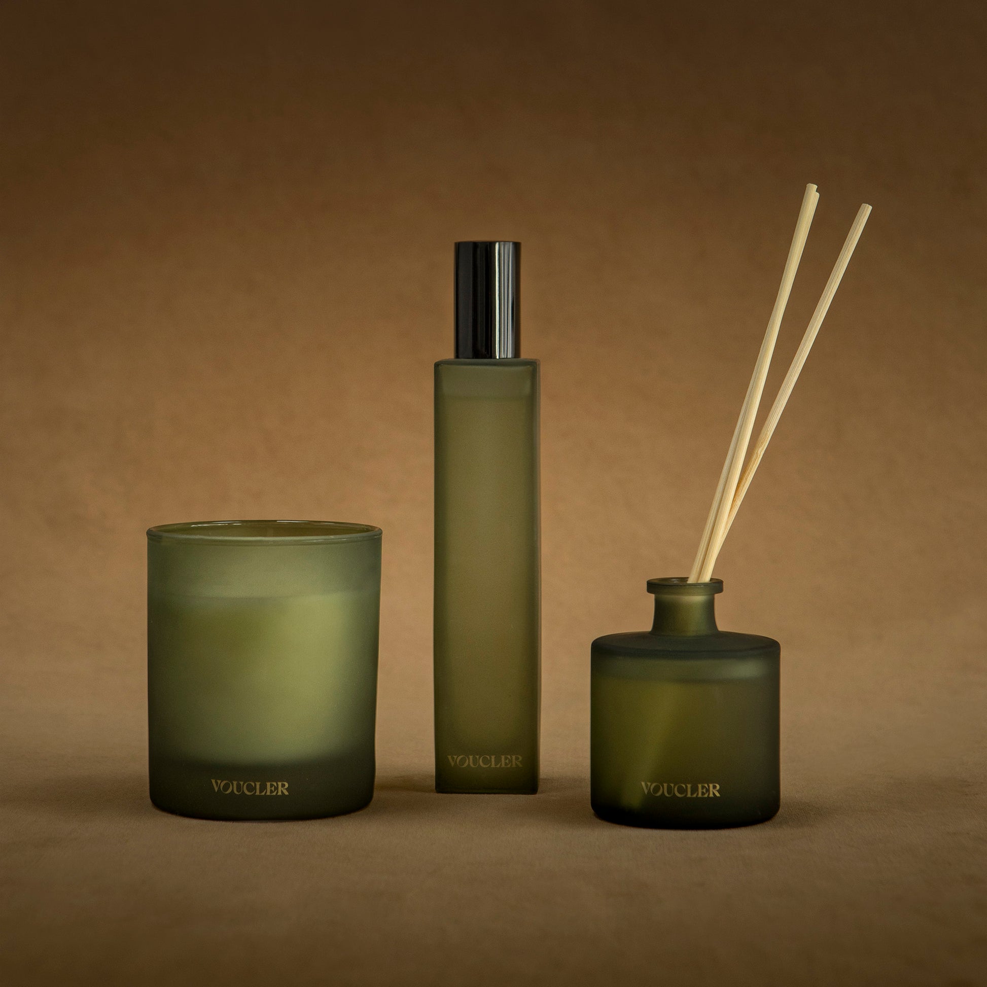 A complete atmospheric transformation for your home. This pack combines a Vivid Sky home spray, a reed diffuser (mikado), and a scented candle — all sharing the same refined fragrance profile. Together, they offer a layered scent experience: the spray for quick refreshment, the diffuser for continuous aroma, and the candle for cozy ambiance. Ideal to create a balanced, elegant environment — whether you’re working, relaxing or hosting guests — that reflects the subtle, harmonious spirit of Voucler.